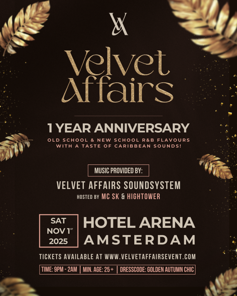 HOMEPAGETICKETSPICTURE GALLERYABOUT USCONTACT Velvet Affairs | Saturday Nov. 1st, 2025 Hotel Arena, Amsterdam Full Picture Gallery Listen to our Spotify playlist With the best Oldschool/ Newschool R&B and Caribbean Sounds! Velvet Affairs: The Playlist Follow us on our socials Velvetaffairsevent Velvetaffairsevent YouTube TikTok Subscribe to our Newsletter: Email Address*